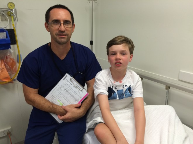 After a great day at the beach, waiting to get picked up, Cole pushed me off a 3 foot railing that I was climbing and split my chin open. There was lots of blood so I went to the Noosa hospital. Doctor Mike glued my chin back together. Today I finally get to swim!